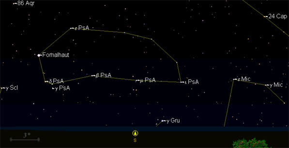 Diese Karte verdeutlicht den Stand der Sternbilder Piscis Austrinis und Microscopium bei Kulmination über dem Horizont meines Beobachtungsplatzes.