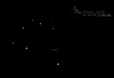 Dieses Objekt ist als Asterismus deklariert, wobei ich jedoch für die Bezeichnung offener Sternhaufen plädiere. Bei 50x zeigt sich ein kleiner deutlicher, fast nebelhaft anmutender Sternknoten. Es sind schon 190x notwendig, um den Haufen aufzulösen. Im Süden befindet sich ein auffällig heller Stern. Inklusive diesem sind 7-8 Sterne direkt zählbar.