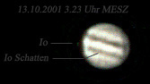 Der Gasriese hielt ein ganz besonders Schauspiel für mich bereit, das sämtliche Oberflächenmerkmale in den Hintergrund drängte. Die Mond Io und Europa zogen heue vor der Planetenscheibe entlang, und warfen ihre Schatten fast gleichzeitig auf die obere Wolkenschicht. Leider gelangte der Planet erst gegen 3 Uhr in mein Gesichtsfeld, als ein Schatten die Oberfläche schon wieder verlassen hatte! Die Mond Ganymed und Europa hielten sich weit ab in sicherer Entfernung von diesem Ereignis auf. 2 Hauptwolkenbänder und 2 schwächere waren ebenso zu erkennen.