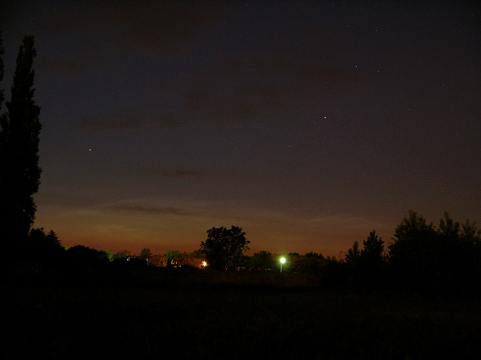 Die Bilder aus Kühlungsborn sahen so verheissungsvoll aus, dass ich mich mitten in der Nacht dann doch noch mal auf den Weg 15km aus der Stadt machte, und im Havelland zwischen dicken Nebelbänken landete. Die NLC waren visuell kaum mehr wahrnehmbar. Zudem verdeckten tiefe Wolken teile des Horizonts. Das folgende Bild zeigt in Horizontnähe noch einige komplexe Strukturen, die visuell aber kaum auszumachen waren.
