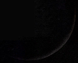 Gegen 16.30 Uhr schob ich dann schon mal den Refraktor auf den Balkon, und begab mich auf die Suche nach der ganz schmalen, nur knapp 2 Tage alten Mondsichel. Erst wurde ich mit dem Feldstecher fündig, dann auch mit dem Teleskop. So eine schmale Sichel hatte ich noch nicht beobachtet! Grund genug, doch einmal einige Versuche mit der Webcam zu machen. Leider war es ziemlich schwierig, die richtige Belichtung zu finden, da sich die Sichel kaum vom hellen Hintergrund abhob. Außerdem machten sich viele Schmutzflecken auf dem CCD-Chip bemerkbar, die sich nur halbwegs vernünftig per Flatfield wieder herausrechnen ließen. Deshalb stelle ich nur eine 25%ige Verkleinerung der Aufnahme in den Bericht.