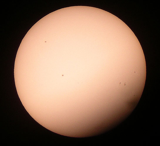 - Die untergehende Sonne knapp über fernen Bäumen. Aufnahme am 2,5" Refraktor mit einer Pentax Optio 555