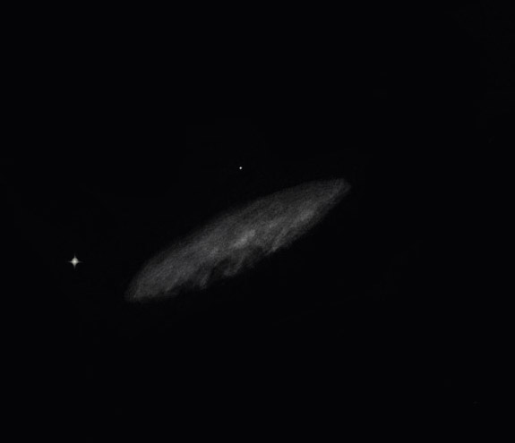 sehr schwacher 3-4:1 elongierter Nebelstreif mit angedeutetem, etwas helleren,