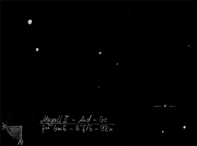 Der Sturm wird wieder stärker. Der Wind ist dabei so eisig, das meine Finger schon fast unbeweglich sind. Es ist einfach nicht mehr möglich, den Stift richtig zu greifen. Die Notizen werden immer unleserlicher. Nach einer Aufwärmpause steht das Objekt der Begierde dieses Abends auf dem Programm. Der extragalaktische Kugelsternhaufen Mayall II gehört zu M31 und ist damit das entfernteste Objekt dieses Typs, das ich bisher versucht habe. Bisher nahm diese Rekordposition NGC 2419 im Lynx ein, den ich schon mit dem 2,5" sichten konnte. Doch bevor ich den Versuch wagen konnte, riss mir der Wind die Aussuchkarte aus den Händen. Nach 100m Jagd, konnte ich den Ausreißer jedoch stellen. Dann begann die spannende Suche...