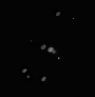 Recht schwach und gerade noch direkt sichtbar. Zudem zeigt sich bei 225x ein relativ schwach aufgehelltes Zentralgebiet, in einem eher ovalen Halo.