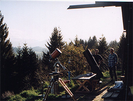 Am 2.5.2003 war es endlich soweit - nach fast 9 Stunden Anreise mit der Bahn aus Berlin, traf ich im Allgäu auf der 1100m hoch gelegenen Hütte von Robert Korn ein. Wenige Minuten nach mir, hatte auch Harry seine kleine Weltreise (er kam aus Wien) überstanden. Robert's Domizil im Südhanglage, mit prächtigem Blick auf die umliegenden schneebedeckten Gipfel der Allgäuer Alpen, bietet für einen Astronomen traumhafte Bedingungen - aber zuerst einmal war der Himmel dicht. Zeit um sich in Ruhe auszutauschen, über das zusammen mit anderen Amateurastronomen veranstaltete DSD-Projekt zu diskutieren, und sich von der anstrengenden Reise zu erholen. Bereits die erste Nacht sollte Beobachtungsmöglichkeiten bieten!