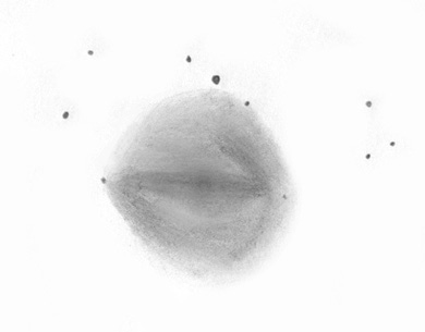 12,5": Der Zentralstern ist einfach zu sehen. Zudem meine ich, eine Unregelmäßigkeit in der Nord-West-Ecke erkennen zu können, was von Robert bestätigt wird Ein recht heller Pn ziemlich großer Pn, den ich noch nie mit diesen Details gesehen habe. Harry probiert sowohl UHC als auch OIII-Filter am Nebel, wobei uns der Eindruck ohne Filter am besten erschien.