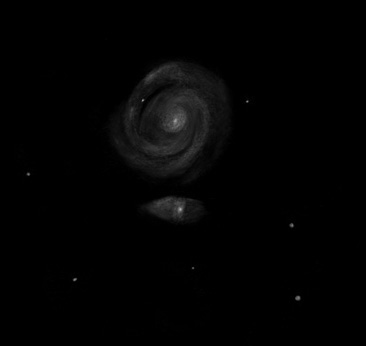 Nach einiger Aufsuchzeit, war ich überrascht, wie groß die Galaxie doch ist. Lag wohl an den schwachen kleinen Objekten, die vorher im Okular waren. Bei 50x waren zunächst einmal 2 helle Nebelscheiben zu erkennen, wobei der Begleiter NGC 5195 nicht einmal halb so groß ist wie M 51, aber der Kernbereich fast genauso hell erscheint. Nach wenigen Sekunden konnte ich bereits den deutlichsten Bogen im Südosten der Galaxie ausmachen. Nach einiger Zeit wurde dann auch im Nordwesten ein deutlicher Bogen. Mehr war bei dieser Vergrößerung nicht zu erkennen. 98x zeigte die gesehen Details dann deutlicher. Ich zeichnete nebenher, um mir ein Bild der Objekte machen zu können, aber so recht wollte sich das Spiralmuster noch nicht zusammenfügen. Sicher - die beiden Hauptarme waren sichtbar, aber ich konnte nicht ihren gesamten Verlauf nachvollziehen.