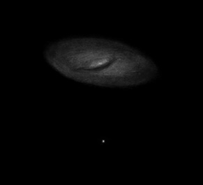 Auch diese Galaxie hatte ich noch nie richtig detailliert mit dem 8"er beobachtet - nur einmal kurz beim letztjährigen Messier-Marathon drübergehoppt. Aber sie war mir aus früheren Feldstecher/Refraktor-Beobachtungen als durchaus sehr helles Objekt bekannt. Die Galaxie ist eher oval, als länglich, mit deutlich abgegrenzten länglichen Zentralgebiet in einem größeren Halo. Der Kern sieht aus wie ein Stern von mindestens 10mag Helligkeit. Schon bei 50x war das Dunkelband zu erhaschen. Mit 98x war es dann zeitweise sogar direkt sichtbar. Es zieht sich im Nordosten am Kern der Galaxie vorbei durch das Zentralgebiet. Die nachvollgende Zeichnung entstand nach einiger Beobachtungszeit.