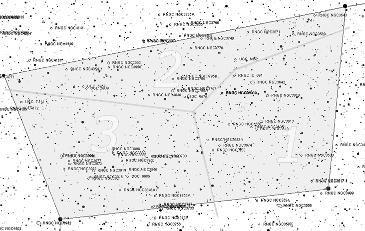 Als Begrenzung für die Zusammenstellung der Objektliste dienten die Verbindungslinien zwischen den hellen Sternen Alpha, Beta, Gamma und Delta UMA. In diesem Bereich nahm ich alle Objekte aus dem NGC/IC-Katalog in die Beobachtungsliste auf. Weiterhin habe ich mir sämtliche UGC-Galaxien auf DSS-Bilder angesehen, und eine visuelle Selektion potentiell erreichbarer Objekte mit in die Liste aufgenommen. Da einige weitere Galaxien aus dem NGC außerhalb des Kastens teilweise auf dem Weg lagen, wurden hier einige zusätzliche Objekte beobachtet. Alles in allem entstand schließlich eine lange Liste von Objekten sowie etliche Aufsuchkarten.