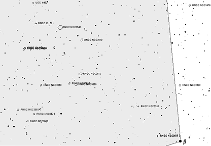 Der erste Beobachtungsabschnitt führt in den südwestlichen Teil des Kastens. Hier finden sich für den Einstieg eine Reihe von helleren Galaxien die selbst mit 3" Öffnung sichtbar sind. Teilweise sind in einem Gesichtsfeld 3 oder mehr einfach sichtbare Objekte zu entdecken. Daneben gibt es aber auch extrem schwache Galaxien zu entdecken, die für meinen 8" absolut am Limit lagen. Als Aufsuchstern bietet sich hier Beta UMa an (siehe nachvollgende Aufsuchkarte). Insgesamt wurden 15 Galaxien beobachtet, wobei es sich bei zwei Objekten um einen "Doppelnebel" handelt (NGC 3690 A/B und NGC 3517). IC 694 liegt leider nicht in der Reichweite eines 8" und blieb somit das einzige Objekt, daß ich nicht beobachten konnte.