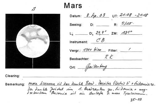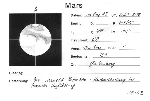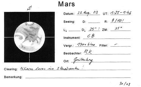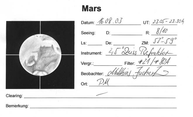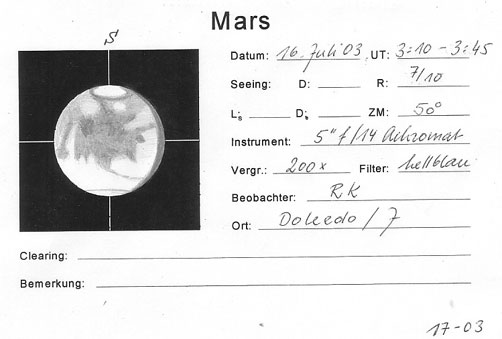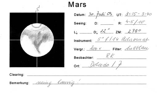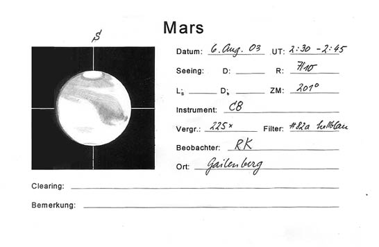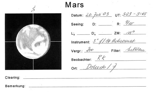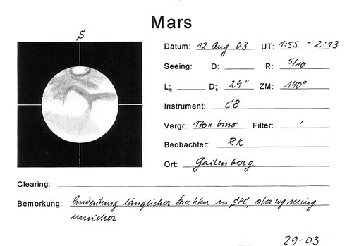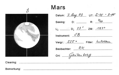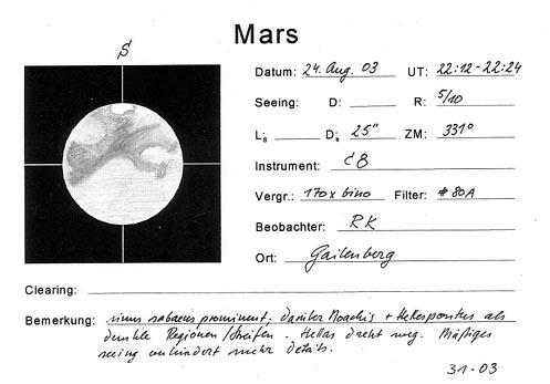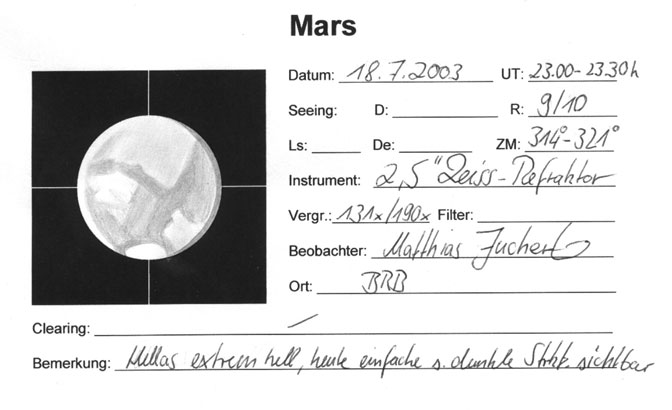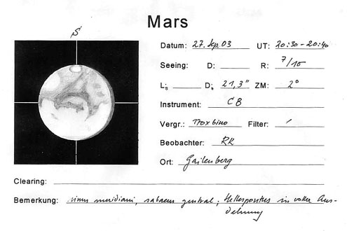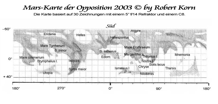 Diese Seite ist der sehr günstigen Mars-Opposition 2003 gewidmet. Hier sollen die Zeichnungen von Robert Korn, und auch meine besten Ergebnisse veröffentlicht werden.