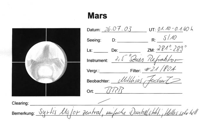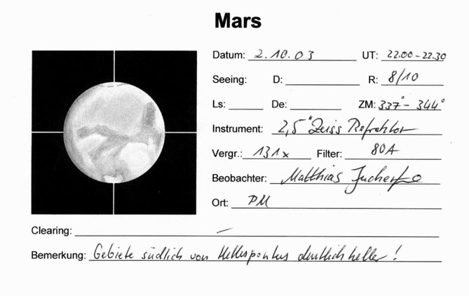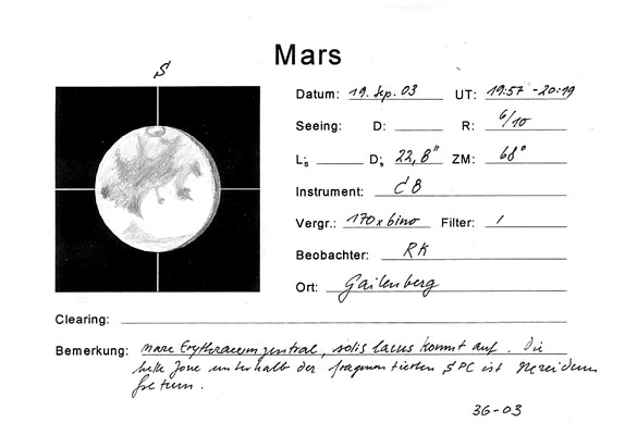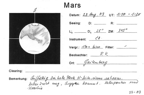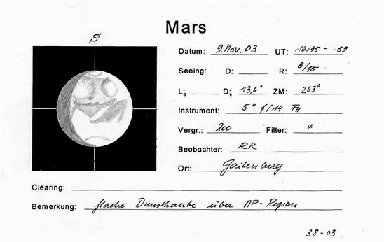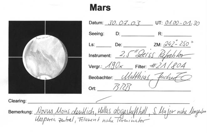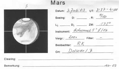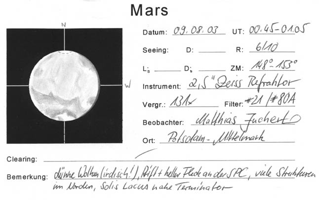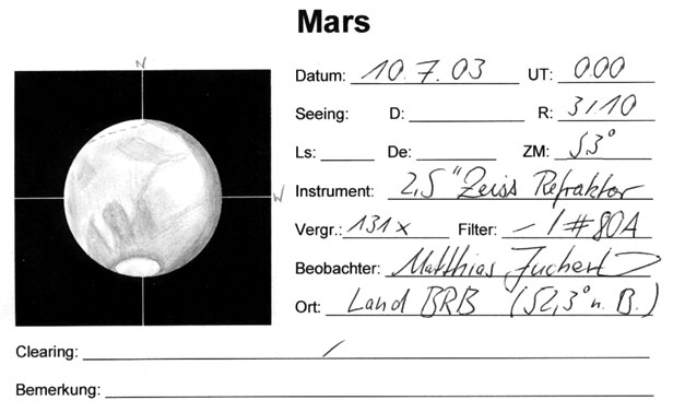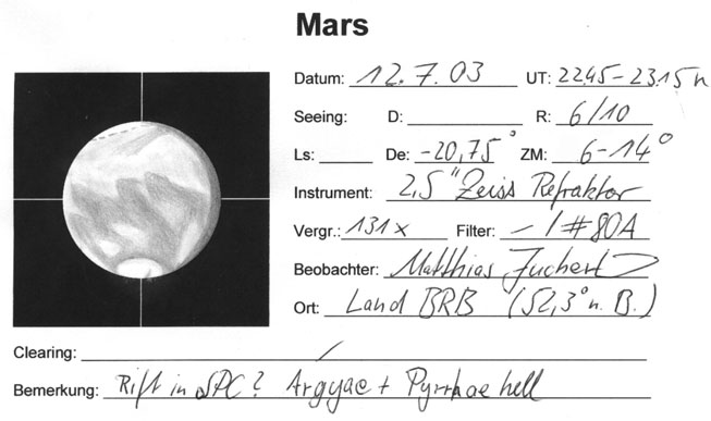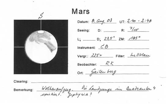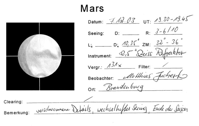 Am Morgen gegen 1.30h MESZ konnte ich durch einige (irdische) Wolkenlücken noch etliche Marsdetails erkennen, aber für eine Zeichnung hat es bei der Bewölkung nicht mehr gereicht.
