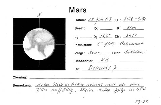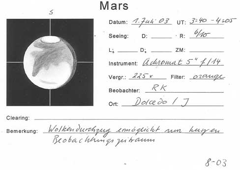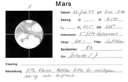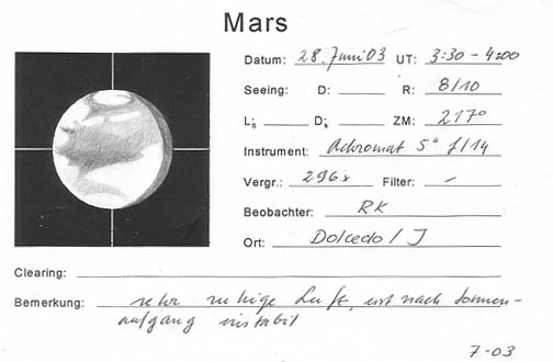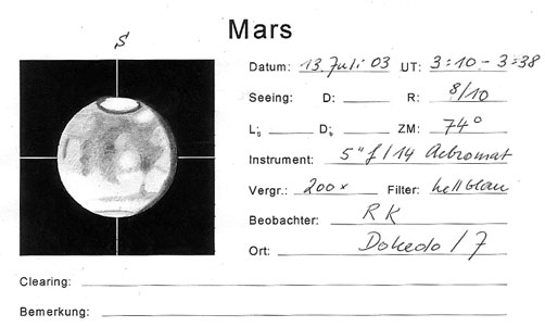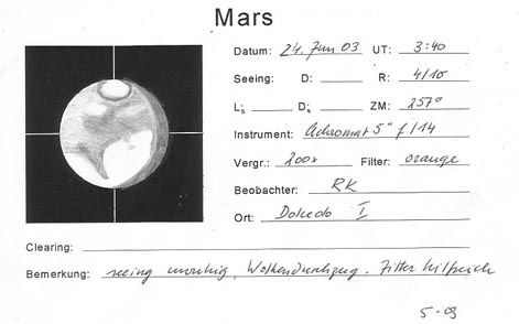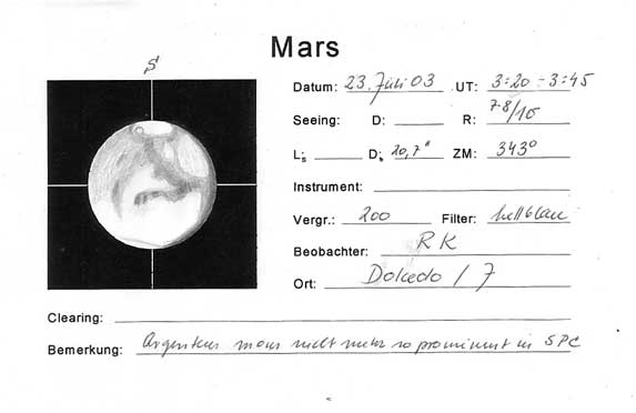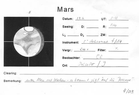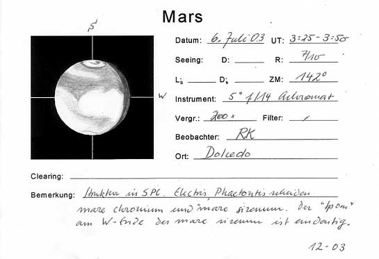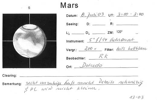 Der Juni 2003 bringt die entscheidende Wendung in der Erscheinung des roten Planeten. Mit dem anwachsen des Scheibchendurchmessers auf bis zu 16" sind die Werte einer Aphel-Opposition bereits erreicht, und im kleinen Refraktor sind Beobachtungen endlich von Erfolg gekrönt. Die SPC strahlt in vollem Glanz.