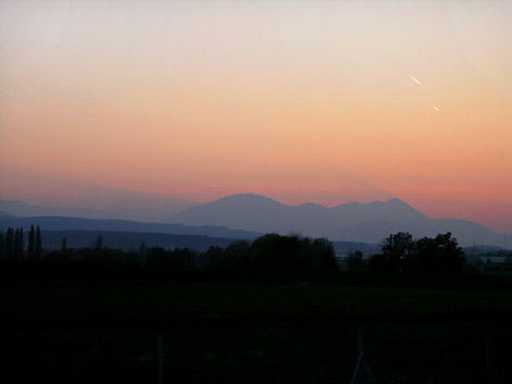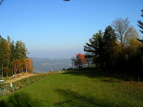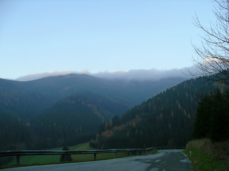 Wir mussten also hoch hinaus. Harry schlug das fast 1800m hohe Stuhleck vor. Hier liegt der Beobachtungsplatz bereits oberhalb der Baumgrenze, ist jedoch mit dem Auto erreichbar. Auf dem Weg dort hin bemerkten wir plötzlich eine dichte Hochnebeldecke über den Bergen im Westen, die deutlich über 1000m hinaus reichte. Nach einigen Kilometern in der Steiermark war es dann aus mit dem blauen Himmel - plötzlich herrschte typisch graues Novemberwetter. Auch die Auffahrt zum 1372m hohen Pfaffensattel - einem Bergpass von dem aus die Mautstraße zum Stuhleck abzweigt - führte uns nicht zum erhofften. Das Stuhleck lag mitten in der hochnebelgefährdeten Zone - die Wolkenbänke in Sichtweite. Wie sich später herausstellte hatte die Hochnebeldecke ihren Ausgangspunkt im Grazer Becken, hatte sich aber noch nicht mit den Hochnebelschwaden im Wiener Becken und am Neusiedler See vereinigt. Nachdem die Passhöhe nach Norden Richtung Semmering überwunden war, herrschte dann aber wieder strahlender Sonnenschein.