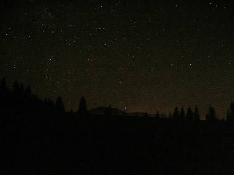 Nachdem wir uns beim Abendessen gestärkt hatten, stand der Entschluss, die Auffahrt zur Kampsteiner Schweig zu wagen. Sie befindet sich östlich des Stuhleck am Wechsel und weckte mit einer Seehöhe von 1400m die Hoffnung, einen Platz über dem Dunst zu finden. Die Anfahrtszeit von Bad Vöslau ist mit insgesamt einer Stunde schon recht lang und die Auffahrt ist, um es mit Harry's Worten zu sagen "rustikal". Als wir aber oben auf der Wiese standen, hatte sich all die Anstrengung gelohnt - der Sternenhimmel war gigantisch.