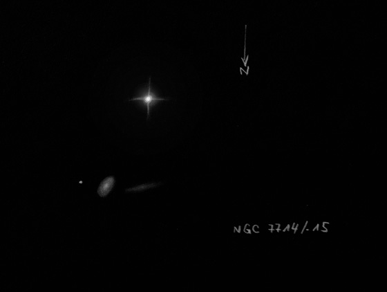 Ein ziemlich schwieriges Objekt - selbst mit 12,5"! Indirekt ist bei 169x in 30-40% der Zeit ein schwacher länglicher Nebelstreif erkennbar, der in Richtung der Nachbargalaxie NGC 7714 elongiert ist. Das Zentrum ist etwas heller als die Außenbereiche. Die beiden Galaxien sind visuell nicht miteinander verbunden.