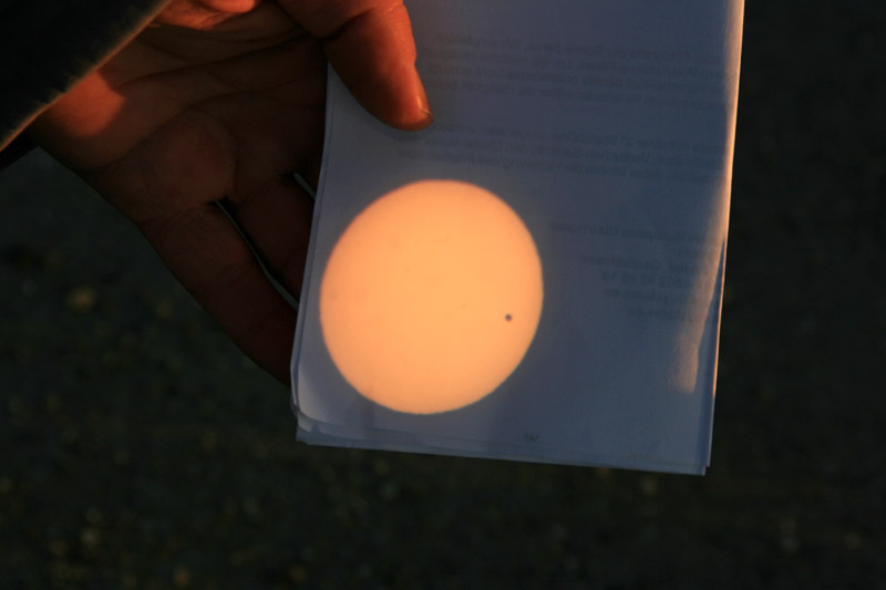 Die erste Aufnahme mit FIlter - die Sonne ist noch stark verformt - trotz schlechtem Seeing ist das Venusscheibchen erkennbar