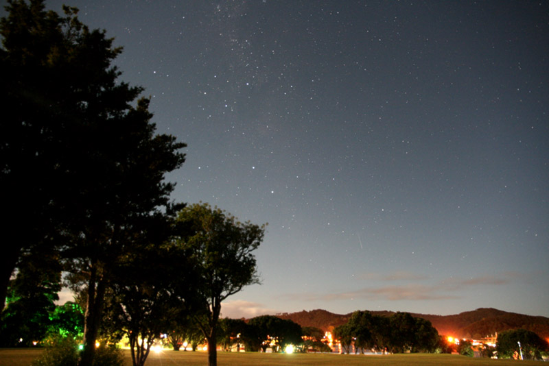 Mein Beobachtungsplatz lag auf einer großen, gepflegten Rasenfläche gegenüber der Waitangi Treaty Grounds. Hier wurde mit dem Vertrag von Waitangi Neuseeland in seiner heutigen Form begründet. Es war also ein besonderer Platz, an dem ich hier im Gras hockte. Die erste Orientierung war schwieriger als erwartete. Sterne, die in Mitteleuropa an der Horizontlinie liegen stehen hier hoch am Himmel. Der Große Hund befindet sich nördlich des Zenits und Orion tief am Nordhimmel! Und der Südhimmel? Alpha und Beta Centauri (oder "The Pointers" wie sie hier genannt werden) bilden mit dem Kreuz des Südens einen auffälligen Anhaltspunkt. Auch das "Falsche Kreuz" (False Crux) zwischen Vela und Carina ist markant. Dann natürlich die beiden hellen Sterne Achernar und Canopus, aber das war es dann schon so langsam. Ein großer Teil des südlichen Himmels erscheint als relativ sternarme Zone.