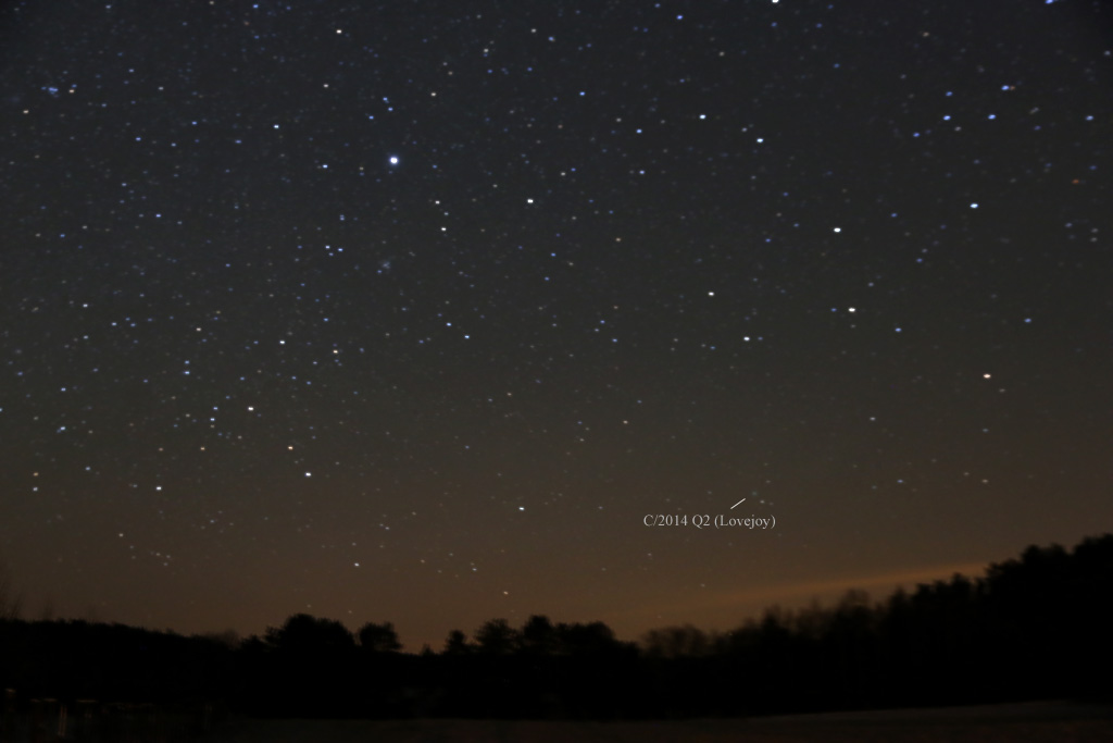 Dank eines Beobachtungstipps der WAA war ich auf den neu entdeckten Komet 2014/Q2 (Lovejoy) aufmerksam geworden. Während meines Weihnachtsurlaubs in Deutschland boten sich in der Nacht vom 26/27.12.2014 nahezu perfekte Bedingungen für die Beobachtung. Leider stand der Komet bei der Beobachtung nur auf etwa -28° Deklination was für den Standort nur 9-10° Horizonthöhe bedeuten. Nichts desto trotz war der Himmel bis zum Horizont sehr klar und der Komet auf einigen Langzeitbelichtungen schnell entdeckt.